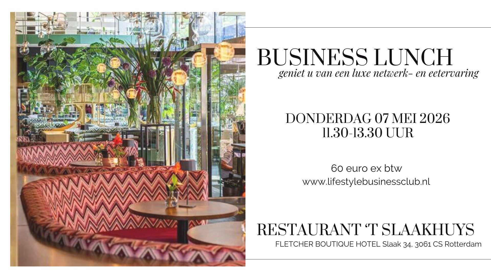 't Slaakhuys RotterdamWij kijken er naar uit om je te mogen ontvangen voor een heerlijke lunch gedurende ons netwerk event. De Lifestyle Business Club is een community van ruim 9,500 lifestyle ondernemers […]
